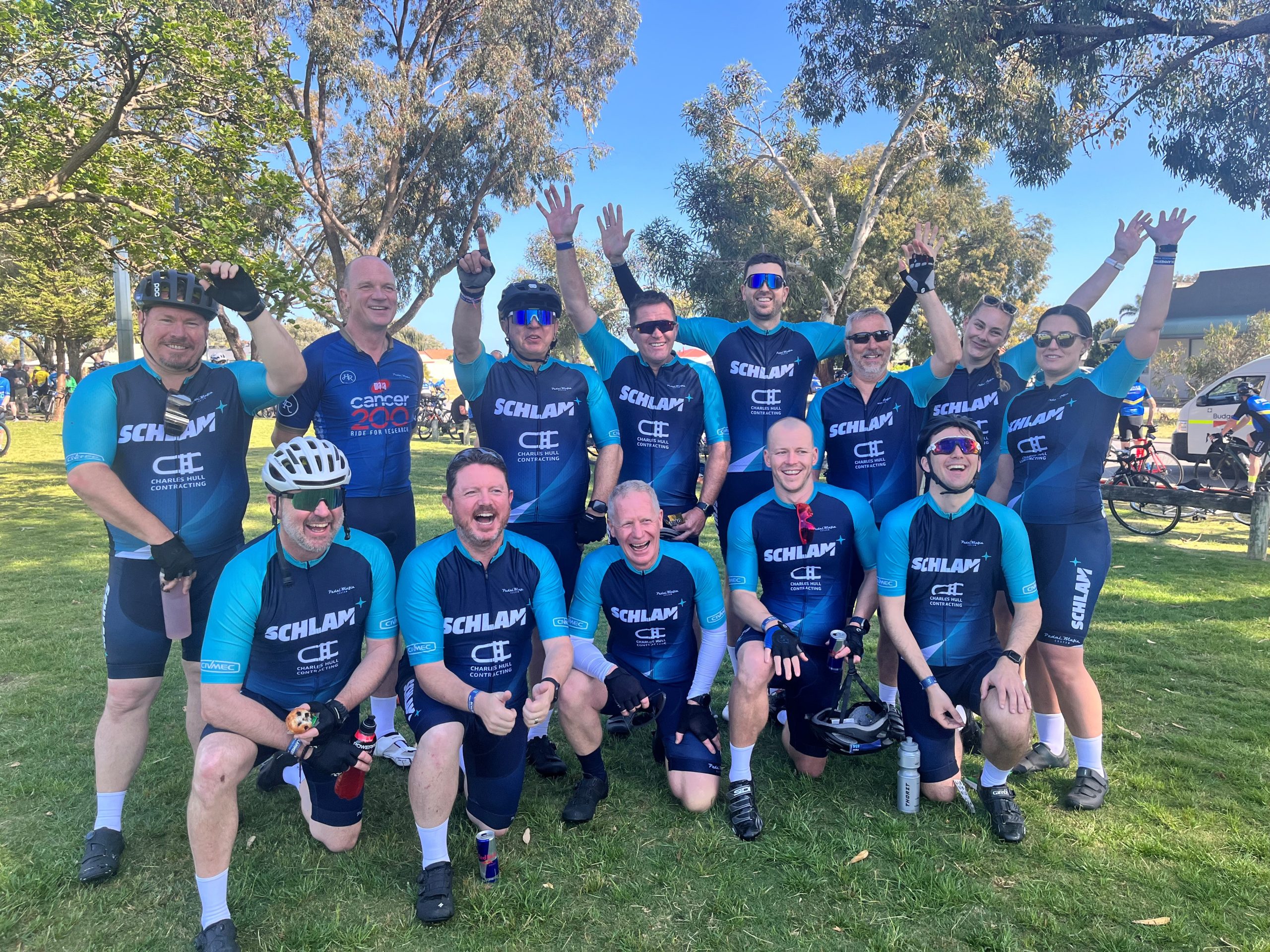 Three seasoned Schlam riders upped the ante by taking on the challenge route, adding an additional 20km to their ride. Arriving in Mandurah the team had a chance to celebrate, reflect on the day’s challenges, and enjoy the afternoon with loved ones who came out to show their support.